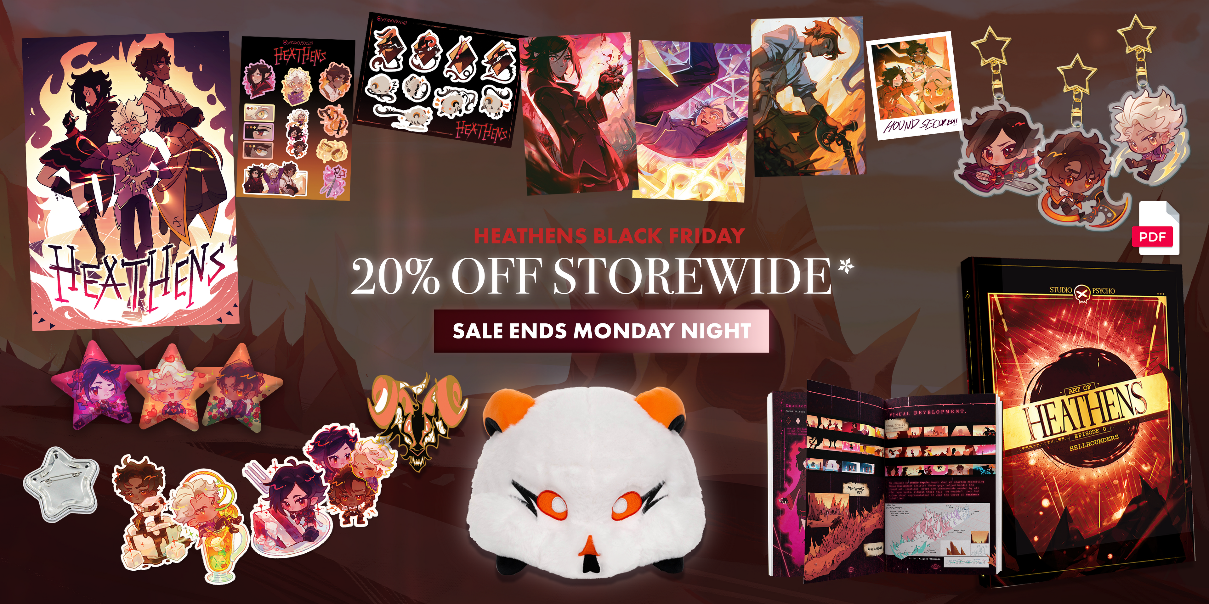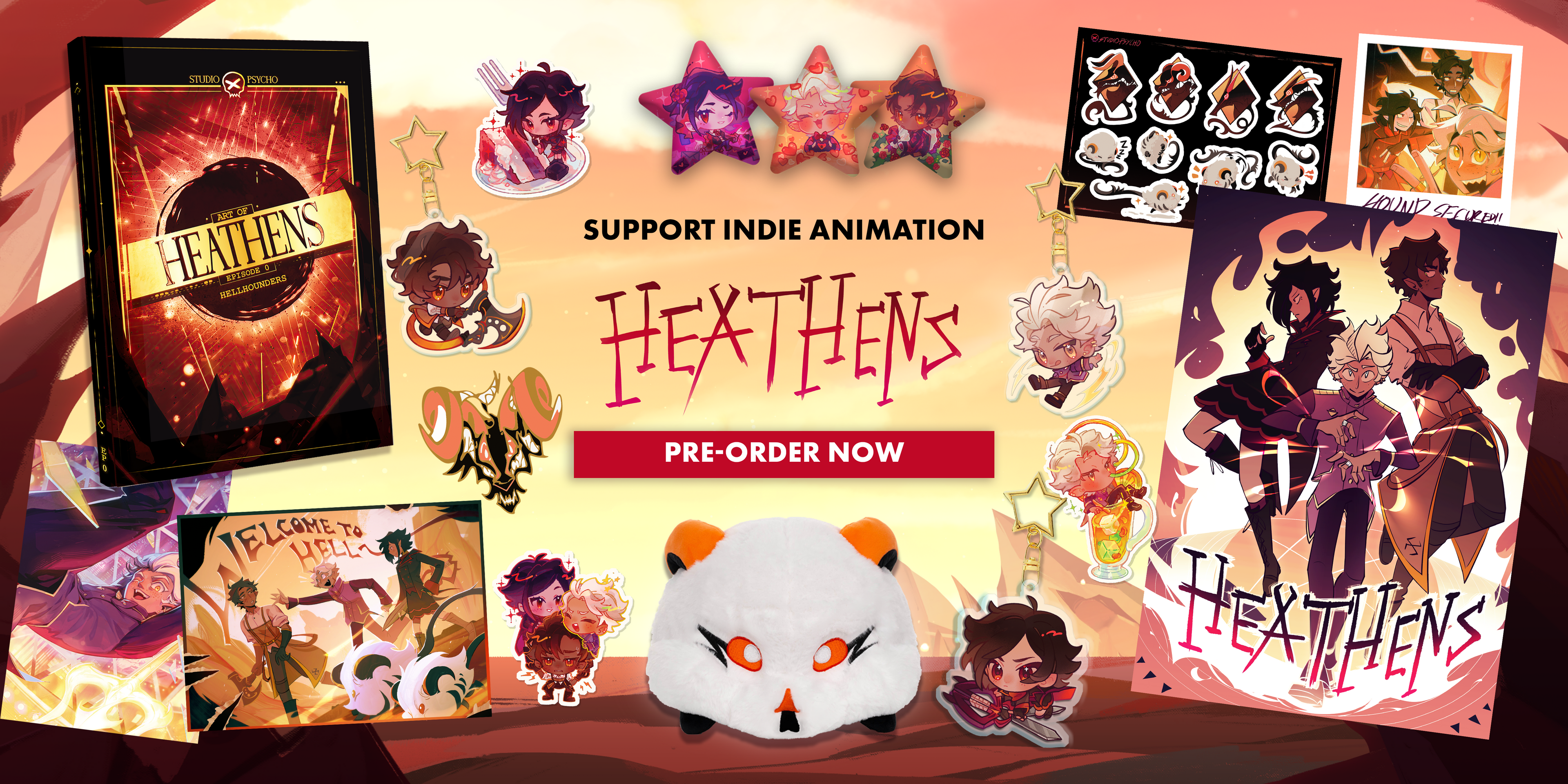 Get your hands on everything HEATHENS. From the fluffiest boy (THROW him against the wall), to all our character merchandise, plus much much more! Get our official HEATHENS poster, Hellhound plush and bonus polaroid all bundled together for an exclusive discounted price! Goin' to Hell and back for this merch!? It means a TON <3 Your support goes towards getting more episodes made.