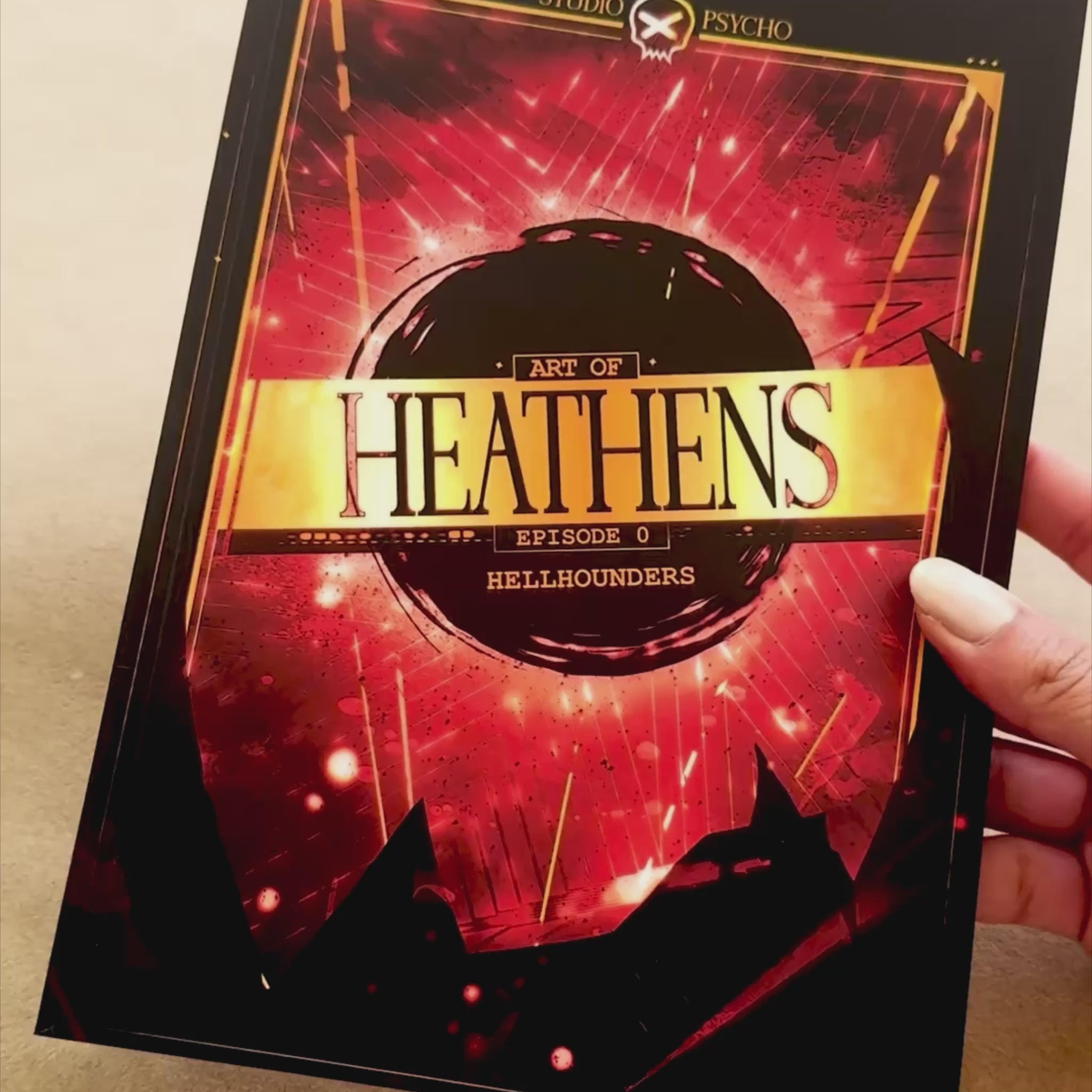 - Physical copy of The Art of HEATHENS Artbook (A5 / 5.8 x 8.2 in, 40+ pages, perfect bound, full color, front cover has a matte lamination finish)